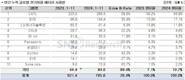 2023년 1월부터 11월까지 전 세계 전기차에 탑재된 총 배터리 사용량은 약 785.6GWh로 전년 동기 대비 26.4% 성장했습니다. 그러나 국내 3사의 글로벌 전기차 배터리 사용량 시장 점유율은 전년 대비 3.7%p 하락한 19.8%에 그쳤습니다.