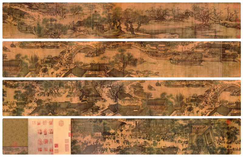 다음은 중국 북송(北宋) 시대의 대표적 화가 장택단(張擇端, 1085년 ~ 1145년 추정)이 그린 걸작 청명상하도(清明上河圖)에 대한 소개와 설명입니다. 첨부된 이미지는 이 명화의 일부 혹은 전체를 다양한 각도로 보여주고 있습니다.