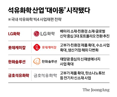 이미지(“석유화학 산업 ‘대이동’ 시작됐다”)는 국내 주요 석유화학 기업들의 사업 재편 및 전략 변화를 보여줍니다.